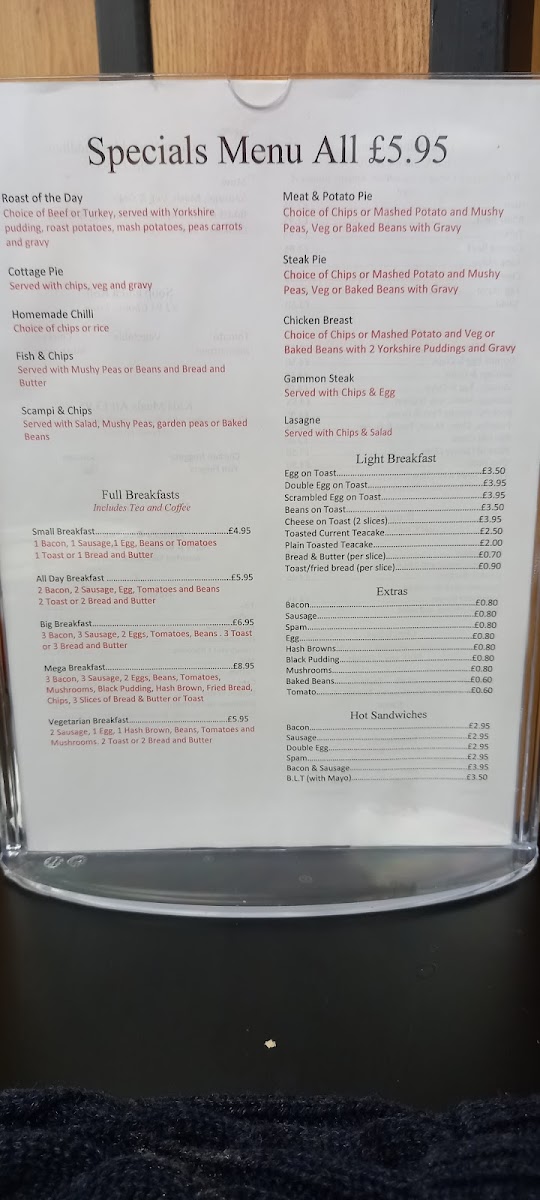 But don’t overlook the Specials Menu if you’re in for lunch or dinner! From the comforting Cottage Pie to the quintessentially British Fish & Chips, each dish is prepared with care and the freshest ingredients. The Lasagne, layered with rich flavors, is a must-have for pasta enthusiasts, while the Roast Of The Day could steal the show on any given day. Let’s not forget to mention desserts; while not specified, the friendly staff can surely guide your sweet tooth cravings.